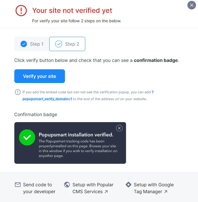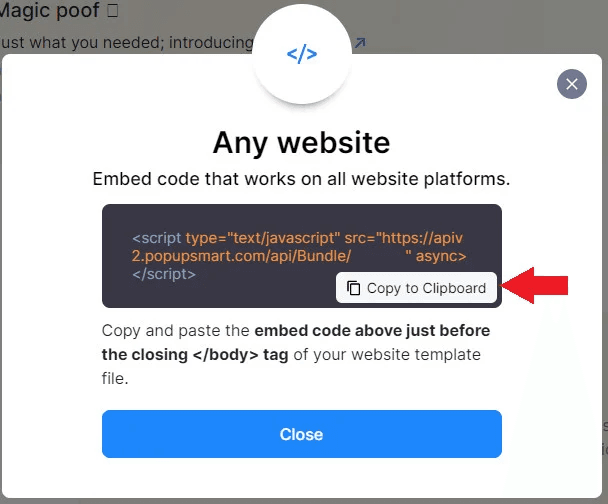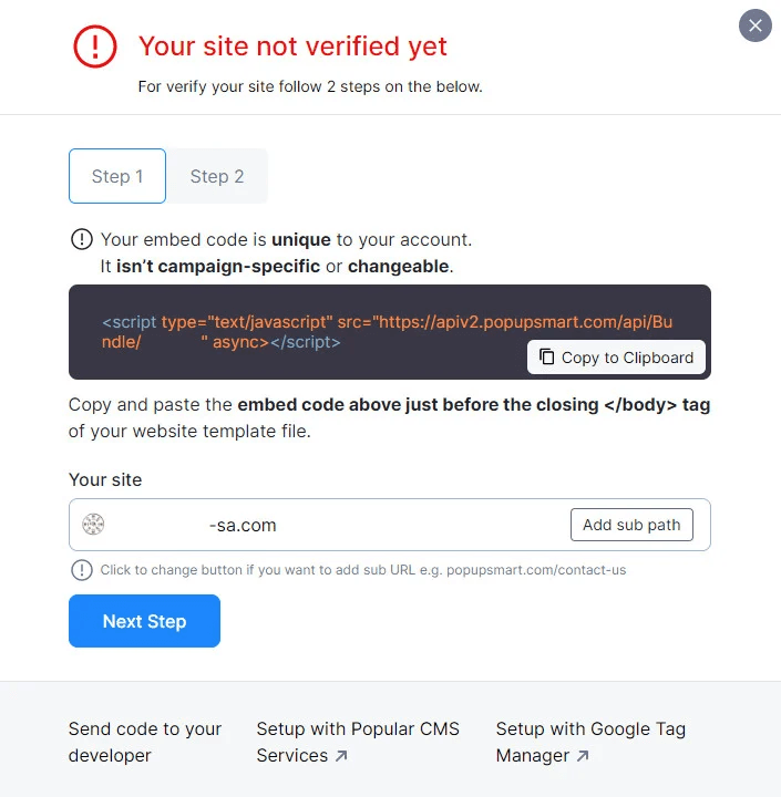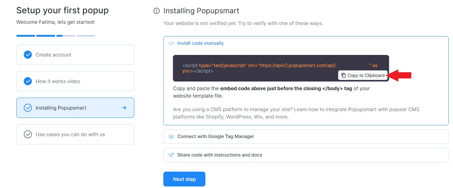 4. In the Installing PopupSmart tab, click Copy to Clipboard, then click Next step to finish the account setup.
