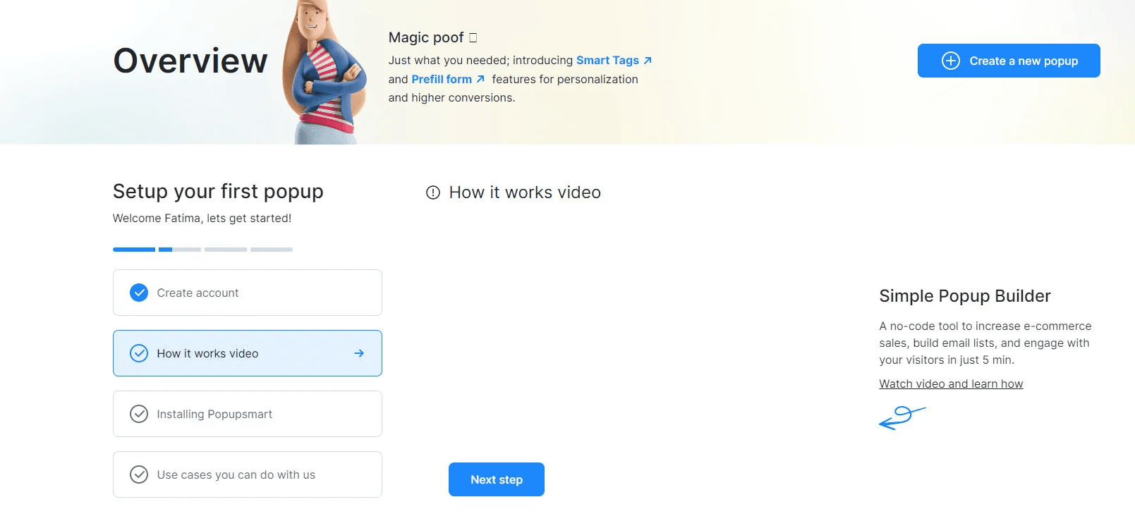 3. Complete the initial account setup. From the How it works video tab, click Next step to continue.