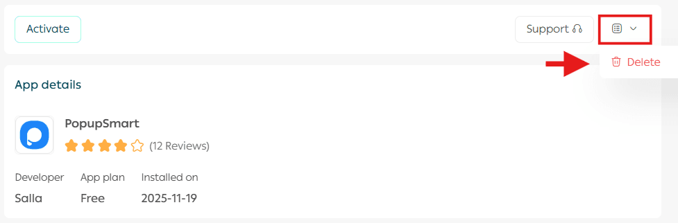 4. From the Installed Apps page, locate PopupSmart, click App Options, then select Activate App.