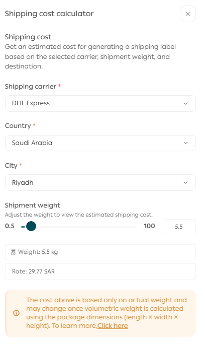 📌 Note: The calculated cost is based on actual weight, but some carriers may use volumetric weight instead.
