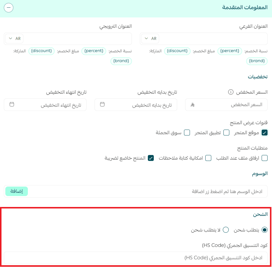 - After selecting the product, go to Advanced details, enable “Requires shipping”, and the HS Code field will appear.