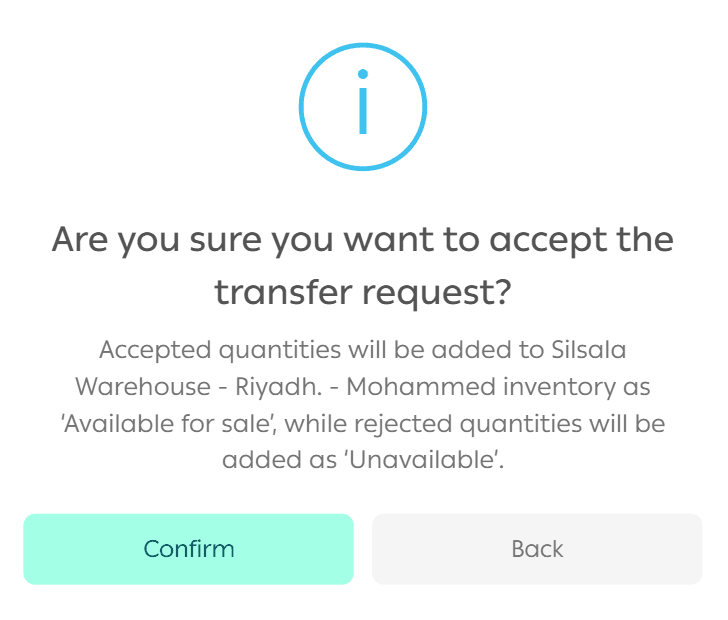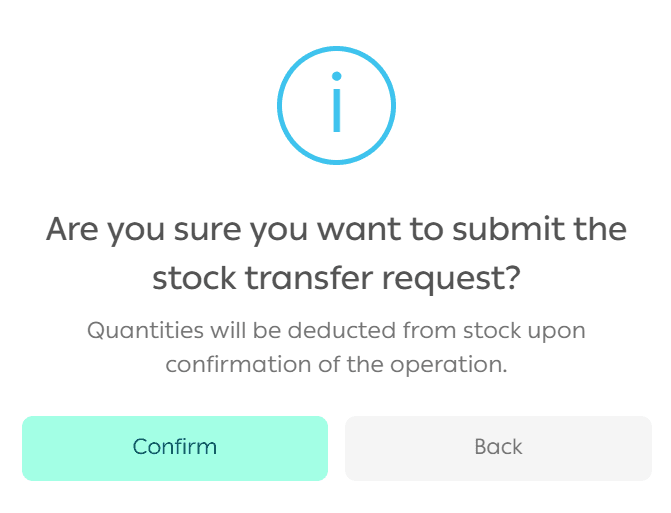 A confirmation message will appear. Click Confirm to finalize the inventory transfer.