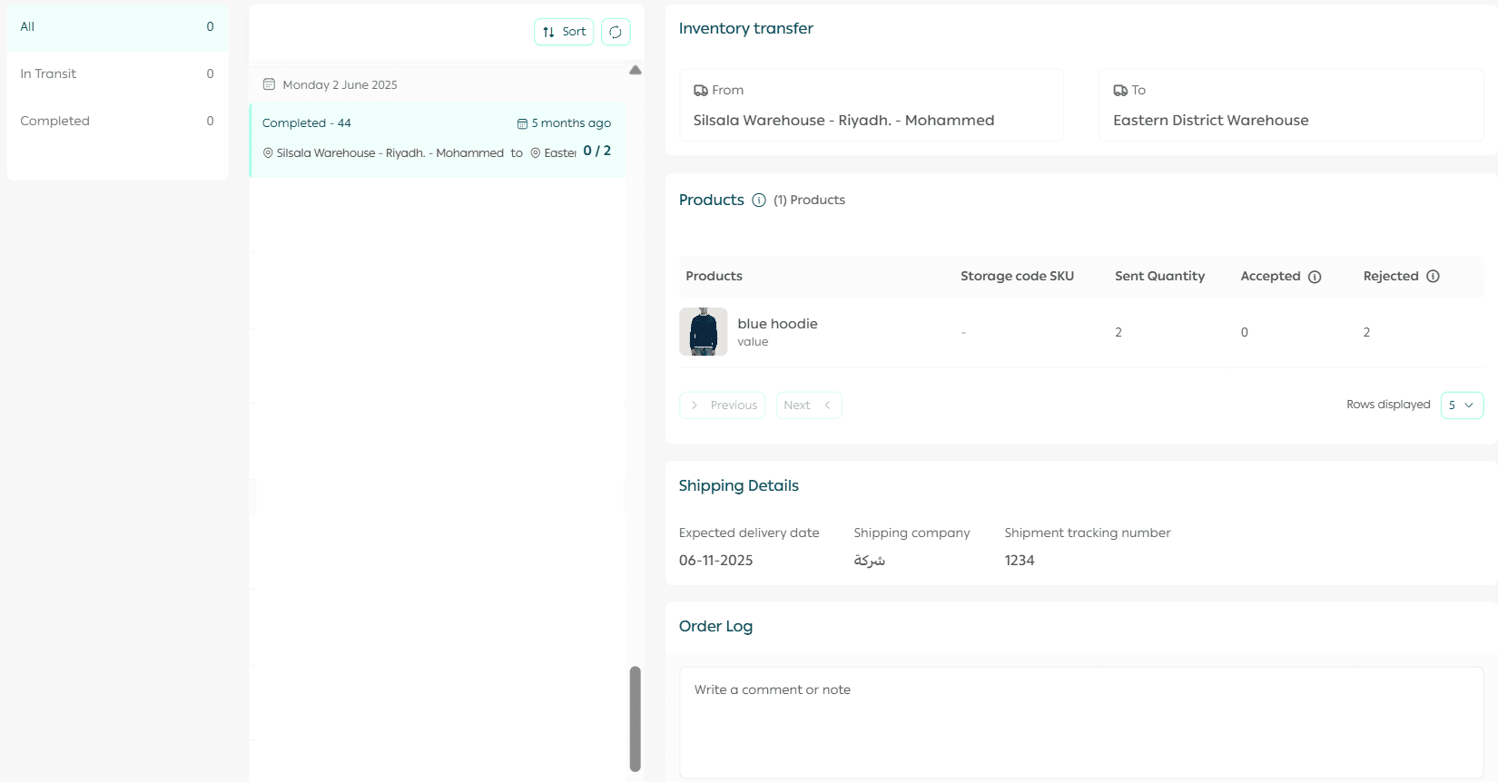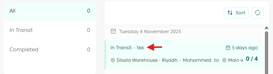 - Use the search bar to find a specific transfer request or track a shipment