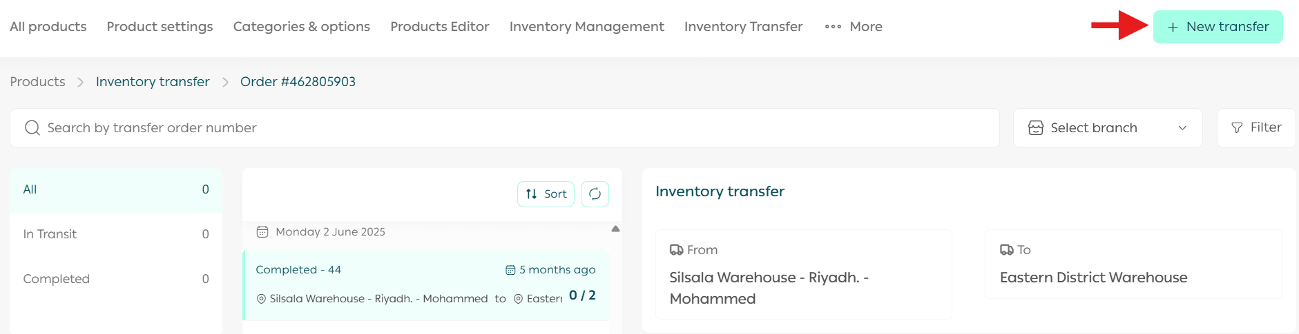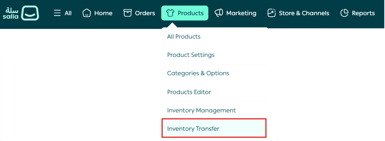 - From the main dashboard menu, click Products, then select Inventory Transfer.