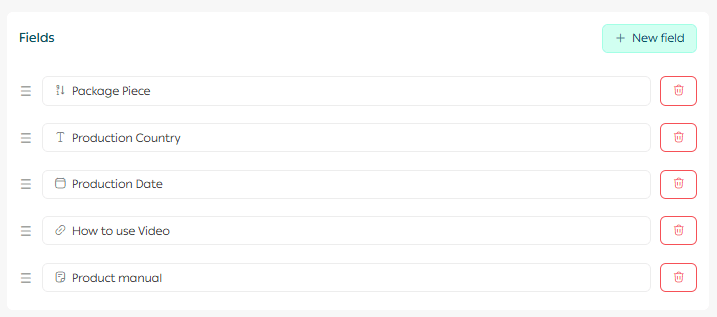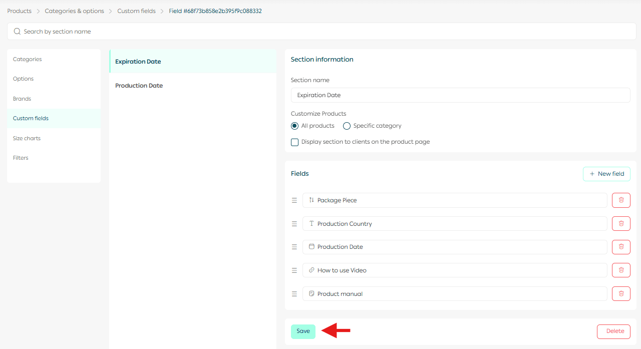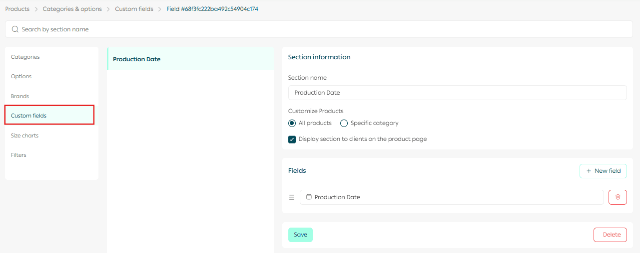 This page allows you to create, organize, and manage all custom fields used across your products.