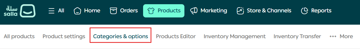 - From the products list, select Categories and Options.