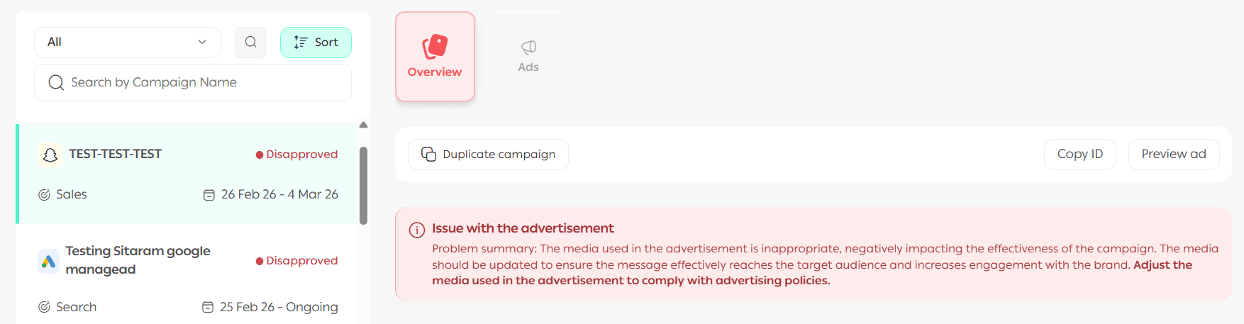 For rejected campaigns, the rejection reason and the recommended solution will be displayed clearly to help you resolve the issue quickly.