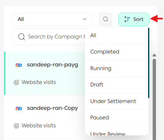 To get a more precise view of your advertising activity, you can filter campaigns by status. From the campaign list, open the filter menu and choose the status you want to display:
