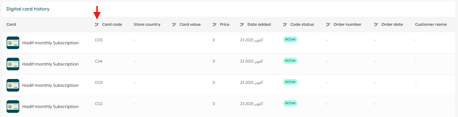 You can reorder the Digital Cards Log by clicking the sort icon next to specific column headers. This helps you organize the data based on what matters most to your workflow.