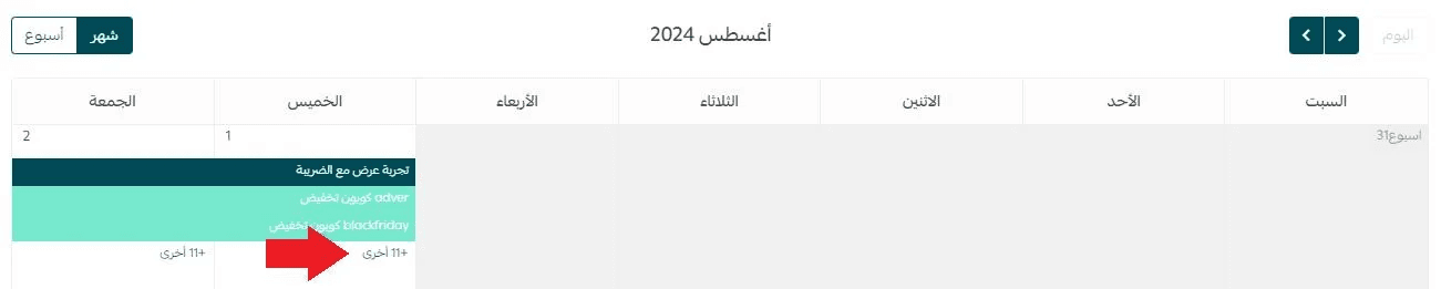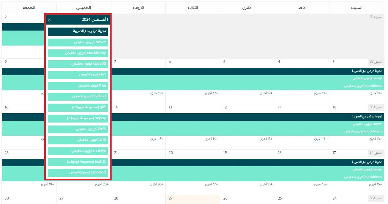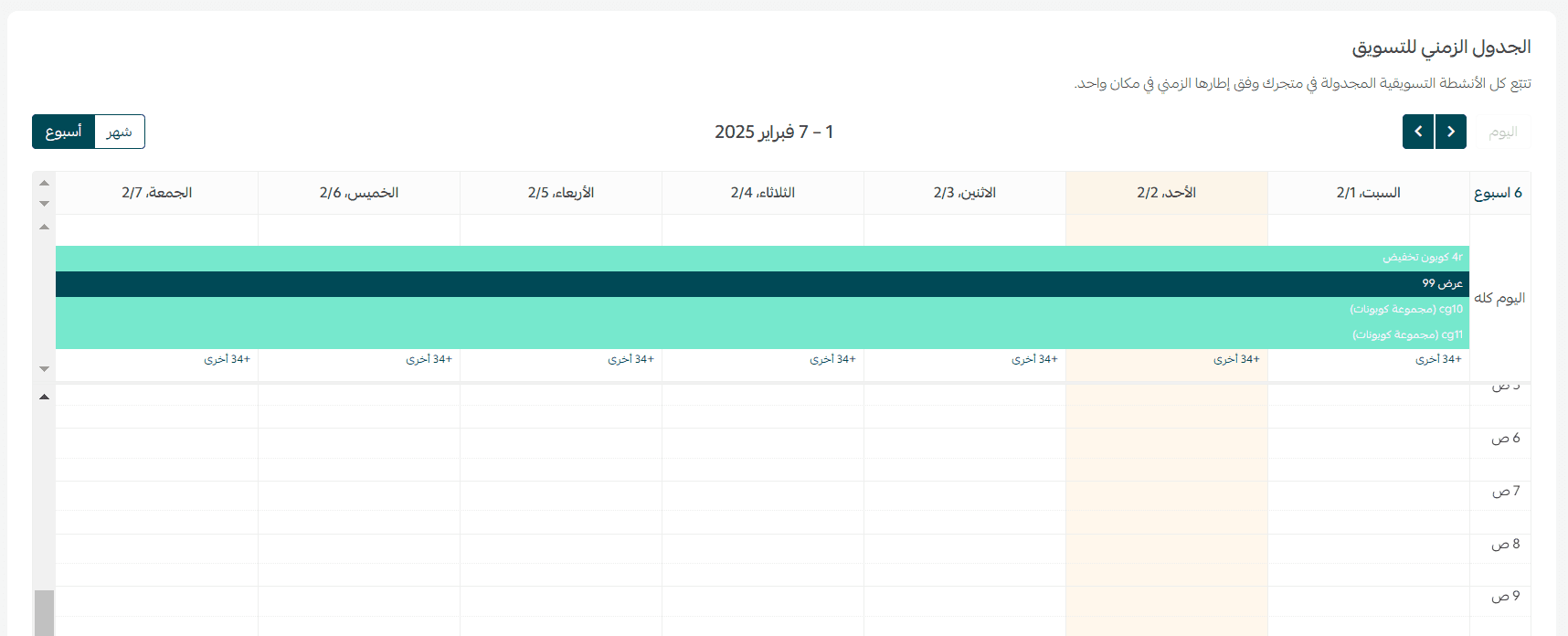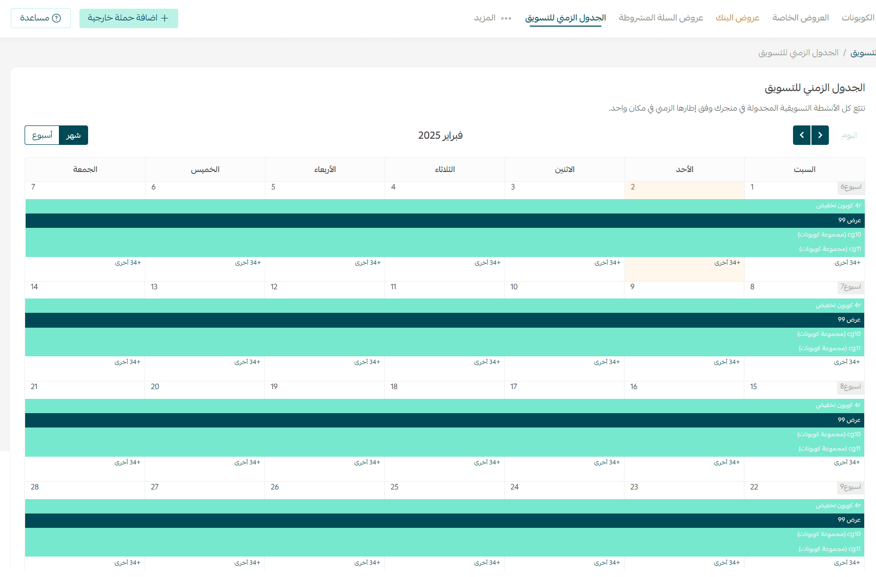 The marketing calendar is a powerful tool that helps you organize all marketing activities in your store. It allows you to view all active offers and discount coupons across different time periods, while also giving you the option to add external campaigns to ensure complete tracking of your marketing efforts.