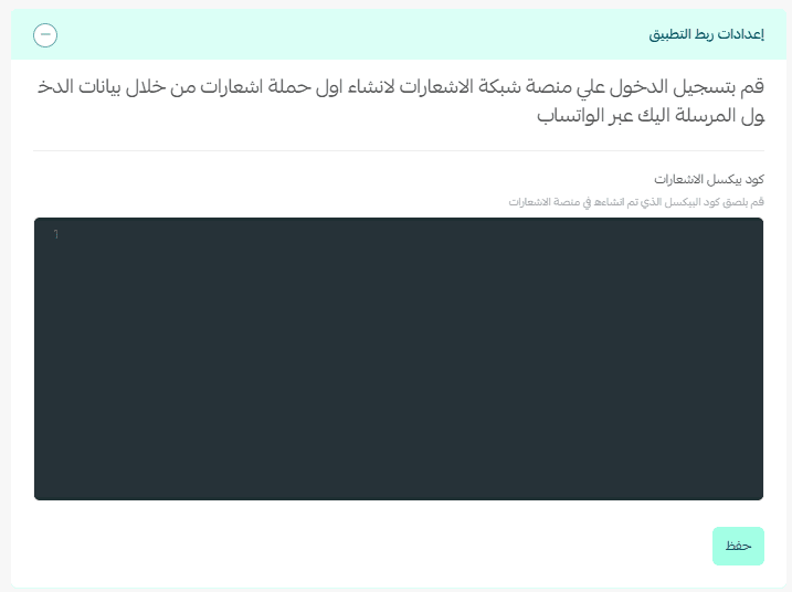 - In the App Integration Settings section, enter the Notifications Pixel Code sent to you via WhatsApp.