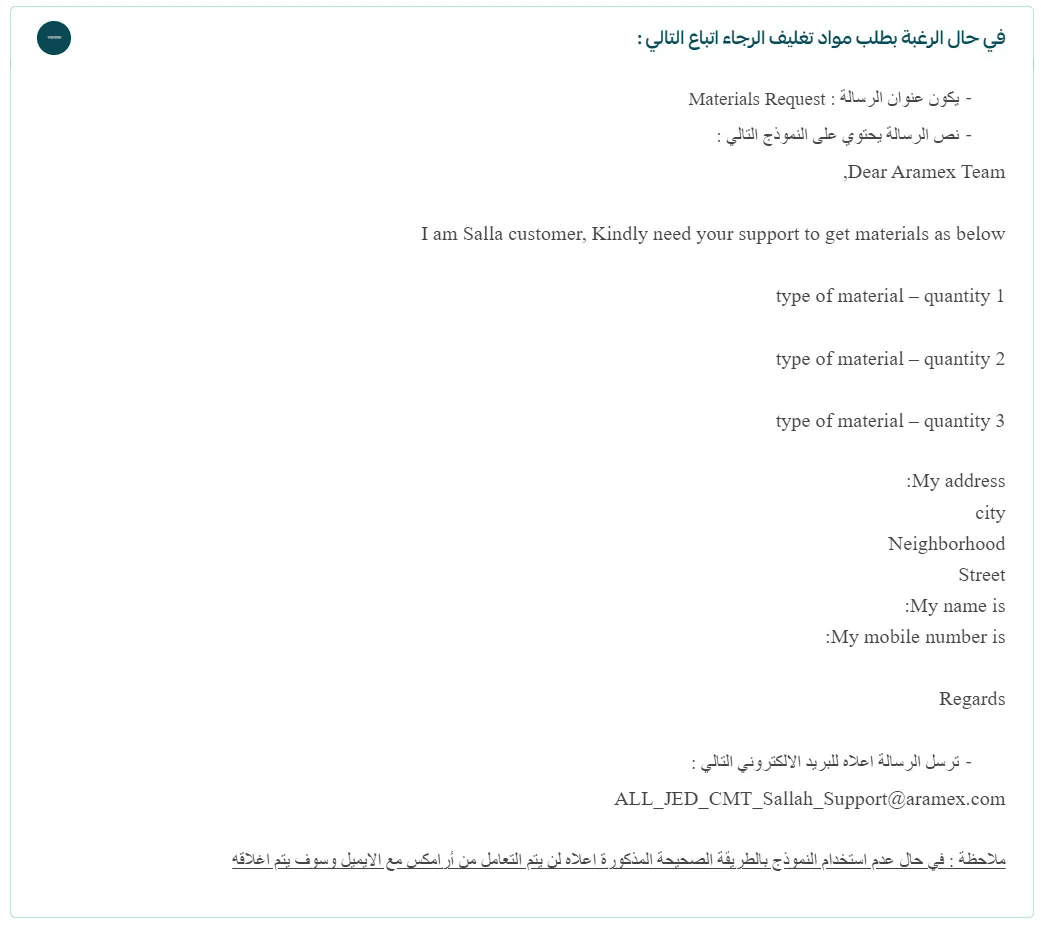 If the template is not used correctly, Aramex will not process the email and the request will be closed.