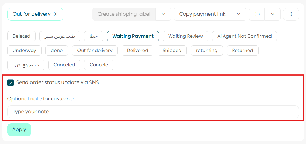 You can also include a short note in the Additional Customer Notes field. This note is sent as part of the SMS message and may include information such as estimated delivery time or confirmation that the order is on the way.