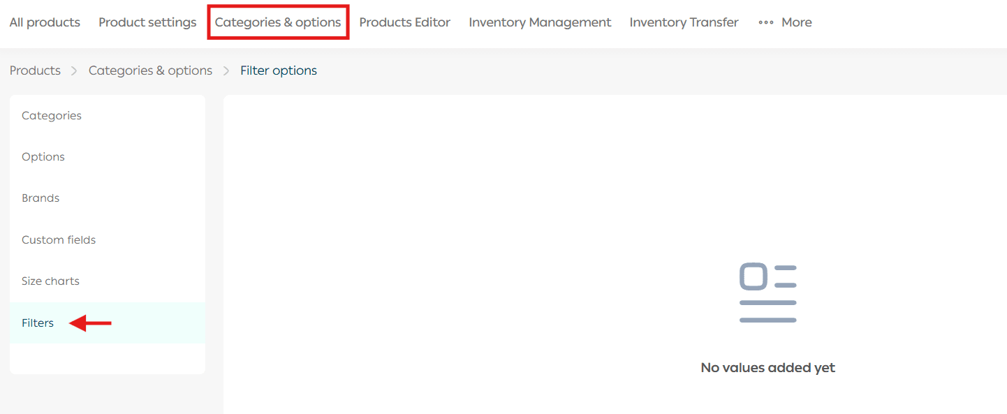 From the Products page, go to the Categories & Options tab, then click Filters.