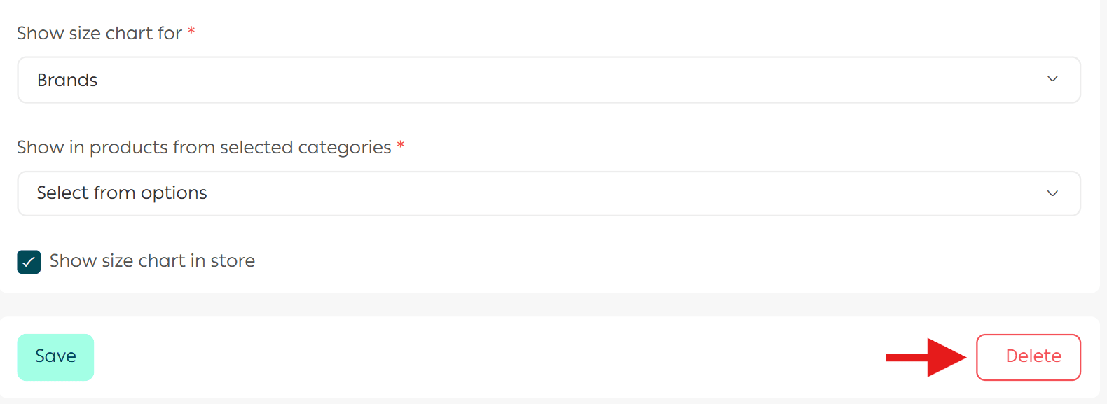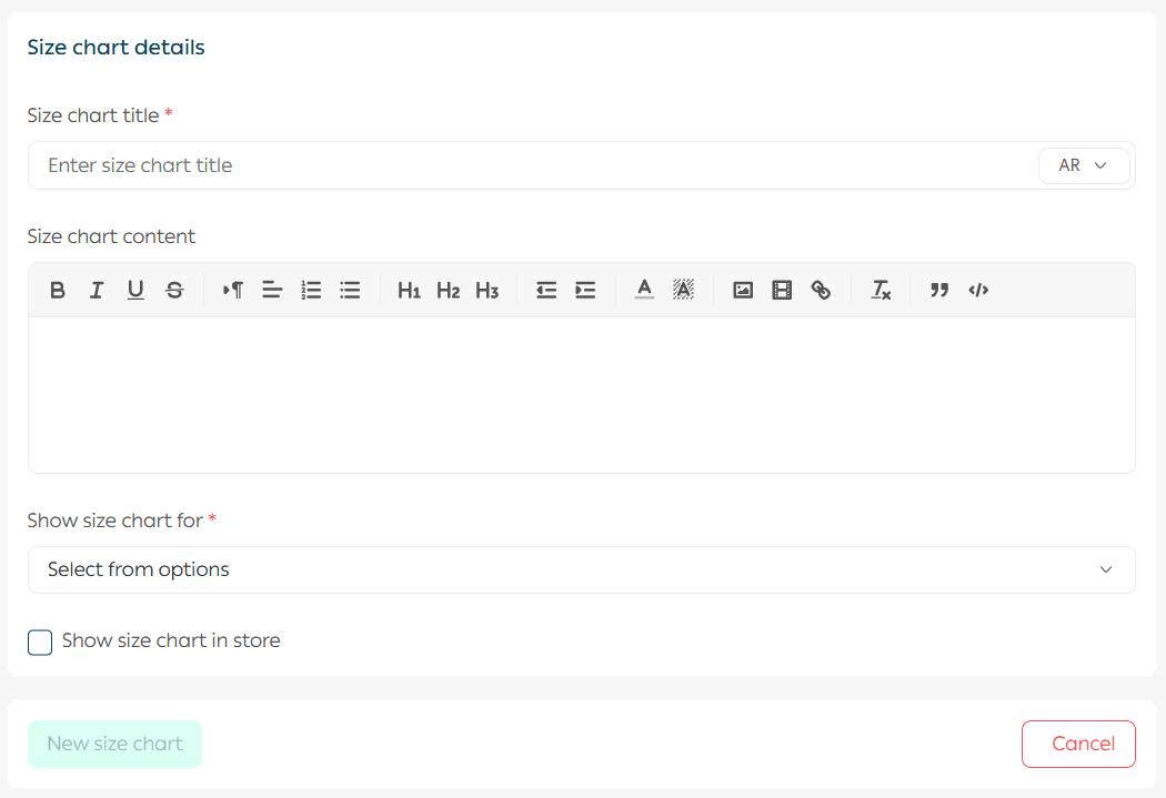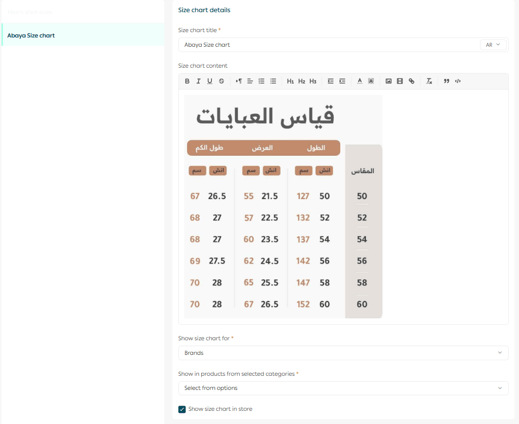 Use the Display Size Chart in Store option to enable or disable the chart’s visibility in your store.