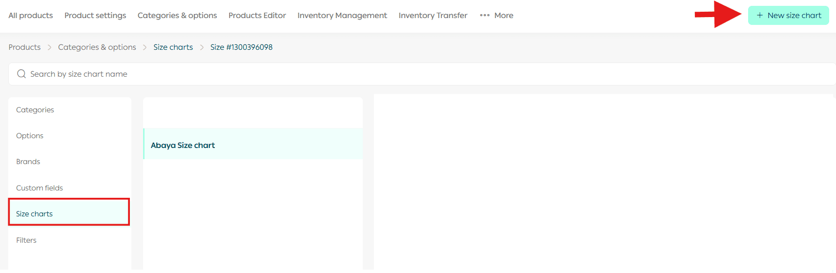 - From the Categories and Options page, click Size Charts, then select Create New Chart.