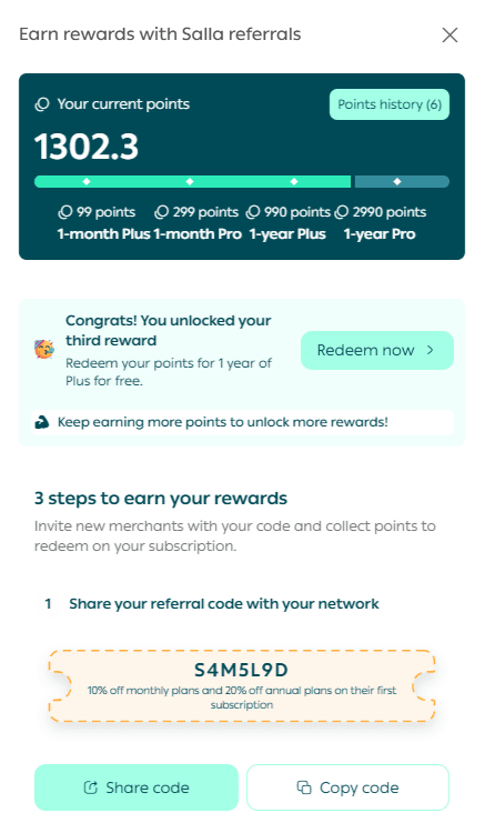 If a new store subscribes to a paid plan for the first time using your referral code, for example the Salla Plus plan for one year: