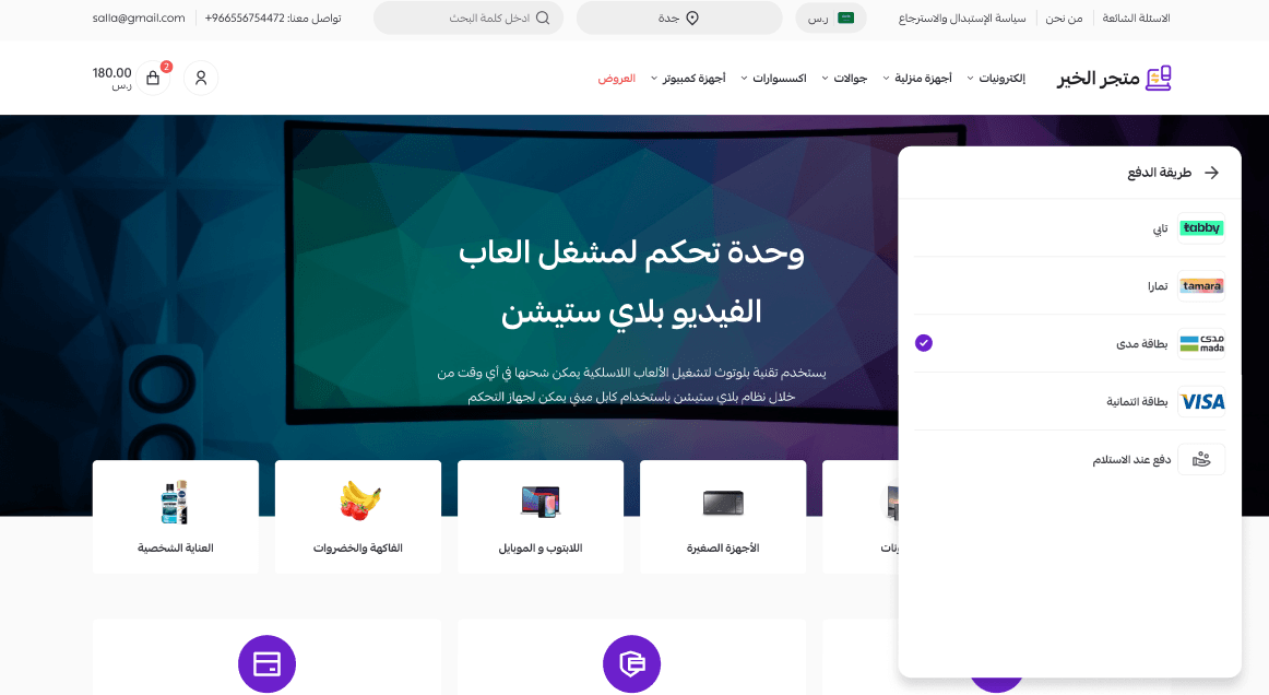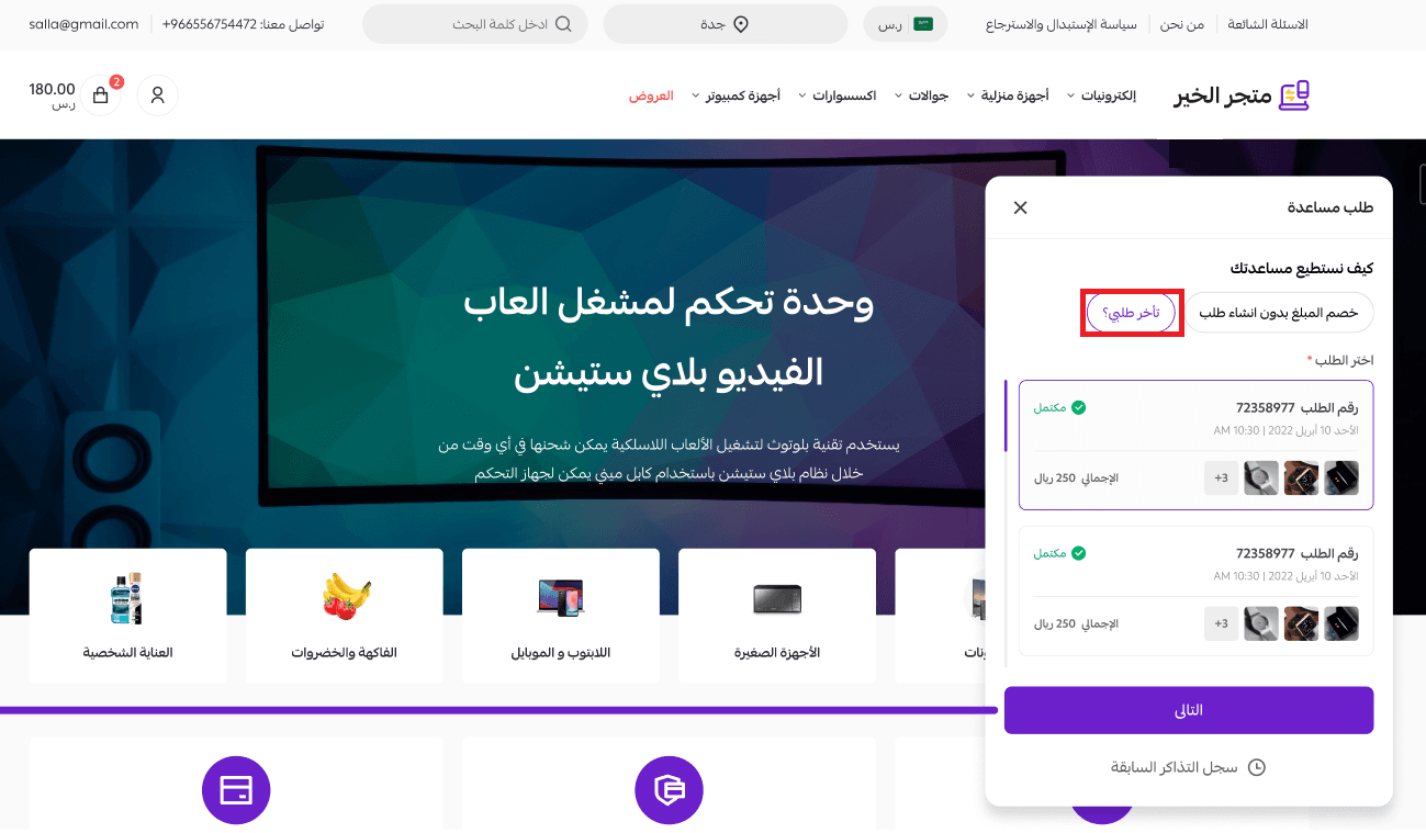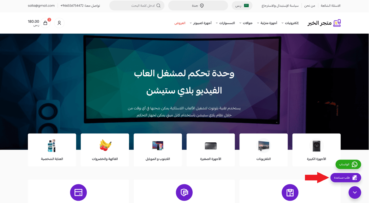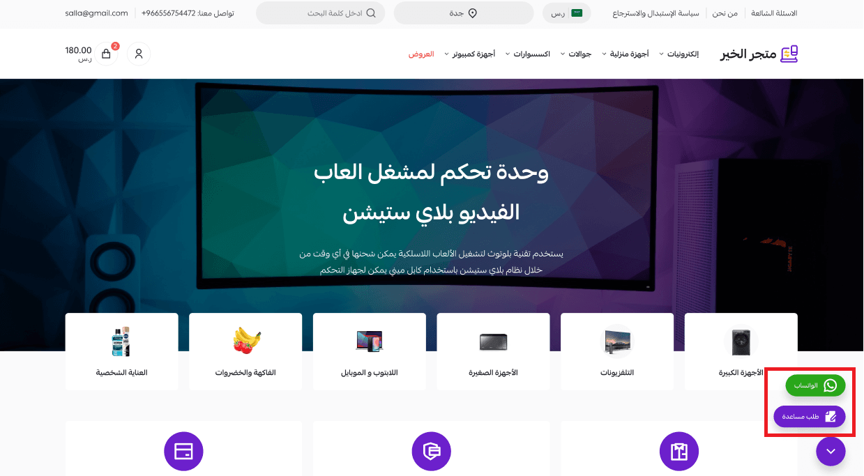 A fixed icon appears at the bottom right of the screen across all Salla stores. Through this icon, customers can contact the store directly via WhatsApp or submit an inquiry through the ticketing system.