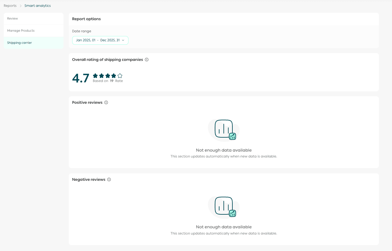 The Smart Analytics section gives merchants clear, real time insights into customer ratings for products and shipping companies.