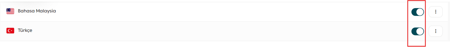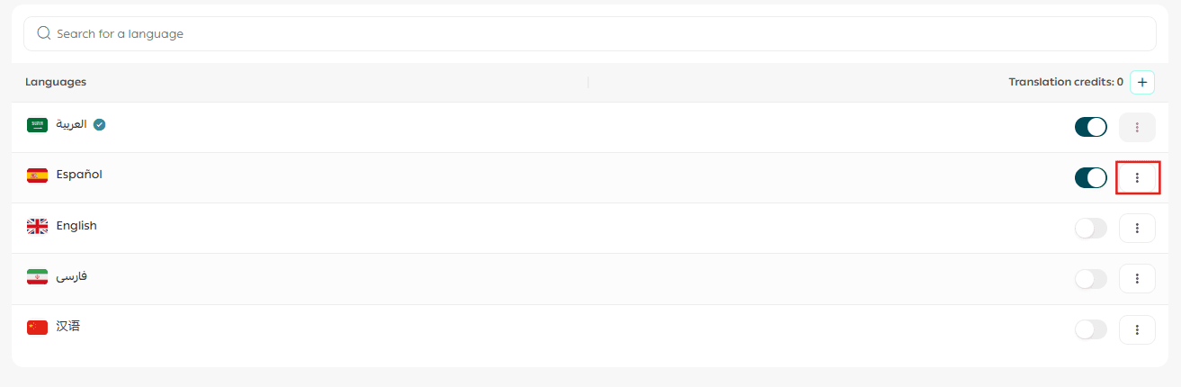 3. On the Languages page, click the three dots ( … ) next to the language you want to translate.