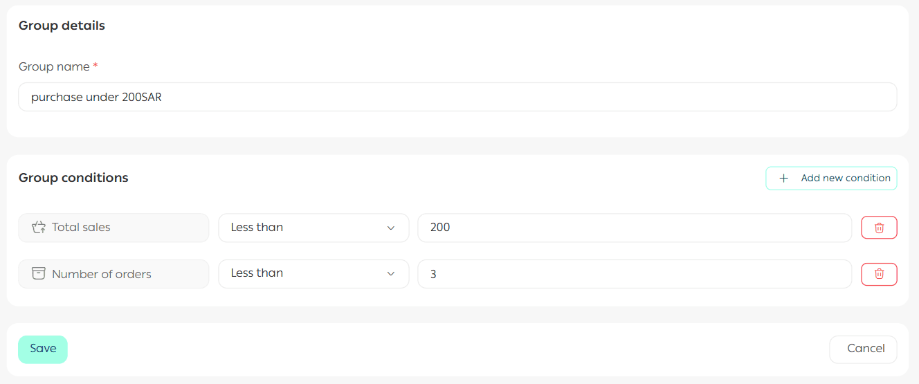 - Create a customer group for customers with total purchases below SAR/AED 200 and fewer than 3 orders.