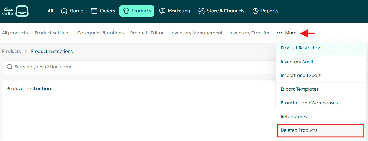 From the More menu, click Deleted Products.