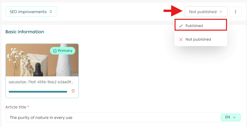 After saving, you can publish the article through Post Actions, then select Published to make it visible on your store blog page.
