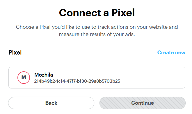 - Select the Pixel you want to connect, or create a new Pixel, then click Continue.