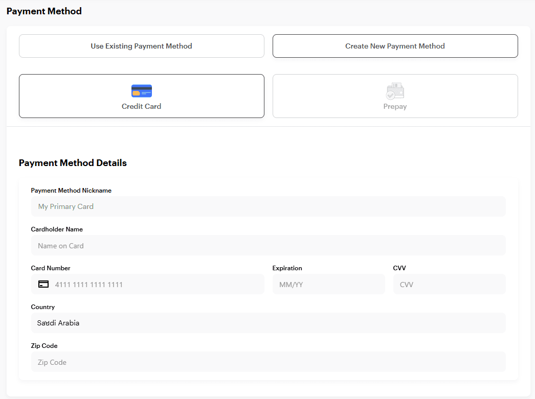 - Choose whether to use an existing payment method or create a new one, then click Save Payment Method. You may follow the provided steps to apply for a credit line if needed.