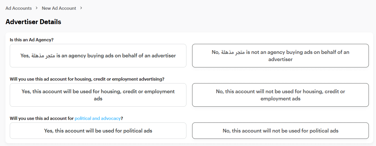 - Select whether you are an agency purchasing ads on behalf of an advertiser or not.