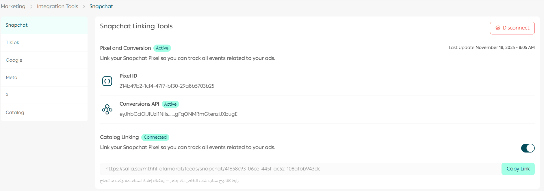 Click the error message shown on the Snapchat Catalog card to identify why products are not syncing. Snapchat catalogs expect a specific set of product fields, so make sure all required metadata is present.